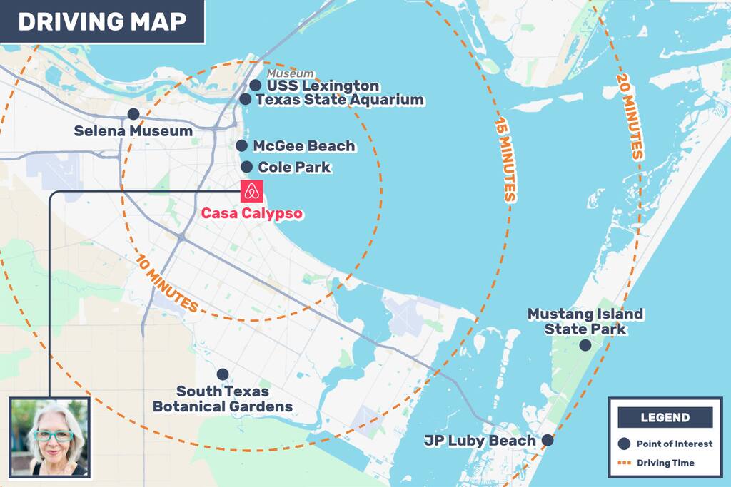 Bus stop is close by. I HIGHLY recommend staying on the water side of S.P.I.D.; the main artery that runs through town. That is, unless you're a fan of franchise restaurants & box stores when traveling to a new place (really?). Downtown, which has unique local restaurants (seafood anyone?) & FUN waterside attractions is a quick 10 minute drive away. Your groceries are a few blocks away at the closest HEB - basic goods only at this one - if you're a foodie at all, you'll want to drive a few miles further to the HEB at Alameda & Robert. DIRECTIONS TO BEACH: From Casa Calypso on Primrose, turn right onto Santa Fe, then left at the traffic light at Doddridge. This will "T" into Ocean Dr., turn right on Ocean and proceed several miles down Ocean until you reach Ennis Joslin - it's a veer right from the far right lane onto EJ whereas if you continued straight on Ocean you would come to a traffic light and continue on to TAMU CC (local university) - also Oso Pier & Grill is at that intersection; fun place to grab some grub on the water in town - they also have live music on Friday nights! Back to Ennis Joslin, proceed until you reach South Padre Island Dr., also known as SPID. Go under the freeway, turn left and proceed onto the entrance ramp. Follow SPID to the island and the beach; you will go over a high bridge - there are two restaurants on the water you can access by exiting SPID at the foot of the bridge - Doc's and Snoopy's - either one is great for seafood and atmosphere! Once on the island, you can either turn left at the first traffic light which is the highway to Port Aransas; you will pass several Beach Access roads that take you straight to the beach. Or you can proceed down the island to Padre Bali Park, where Bob Hall Pier is - you don't have to drive on the beach here, there are fresh water showers, and Mikel May's is a fun restaurant on the pier! If you do drive on the beach, make sure driving conditions are favorable; with the lack of rain comes very dry sand and cars that get stuck - no fun! Just remember to KEEP GOING & DO NOT slow down when you drive through powdery sand!